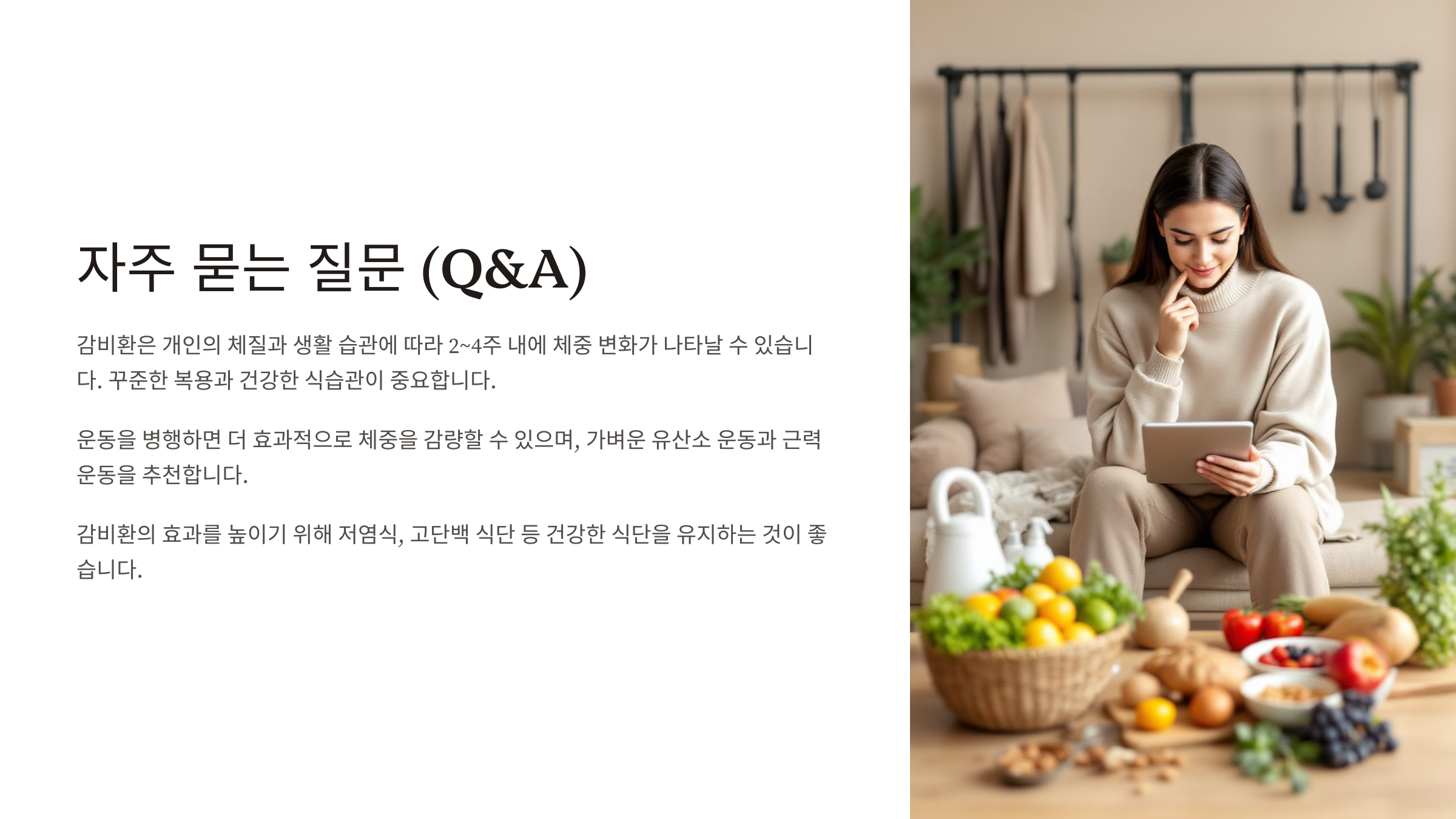 A4. 감비환 복용을 중단한 후에도 건강한 생활 습관을 유지하면 요요 현상을 방지할 수 있습니다. 갑작스러운 중단보다는 점진적으로 줄이는 것이 좋습니다.