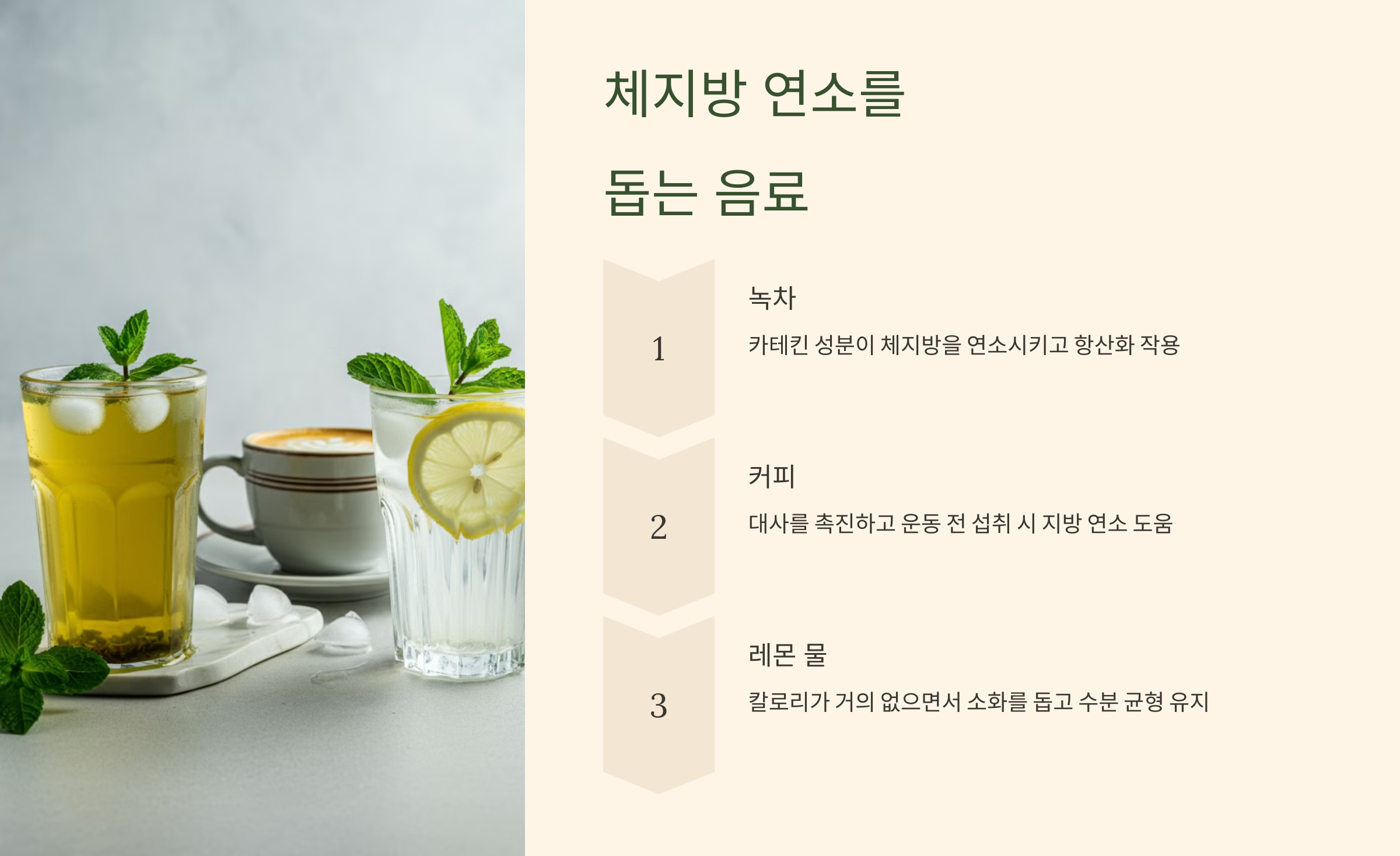 - 커피: 적당량의 커피는 대사를 촉진하고, 운동 전 섭취 시 지방 연소를 도울 수 있습니다.