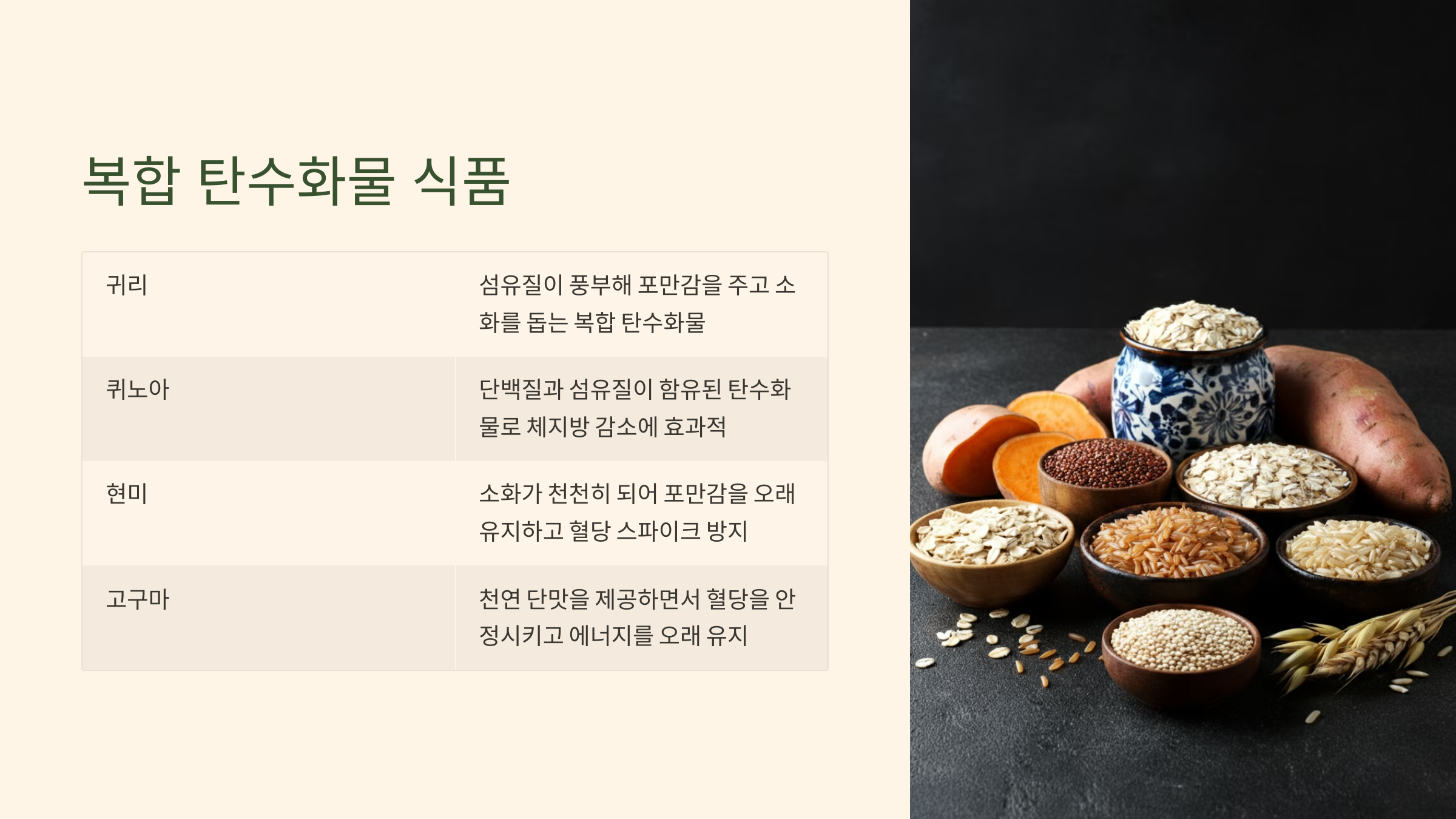 - 고구마: 천연 단맛을 제공하면서도 혈당을 안정시키고 에너지를 오래 유지할 수 있습니다.