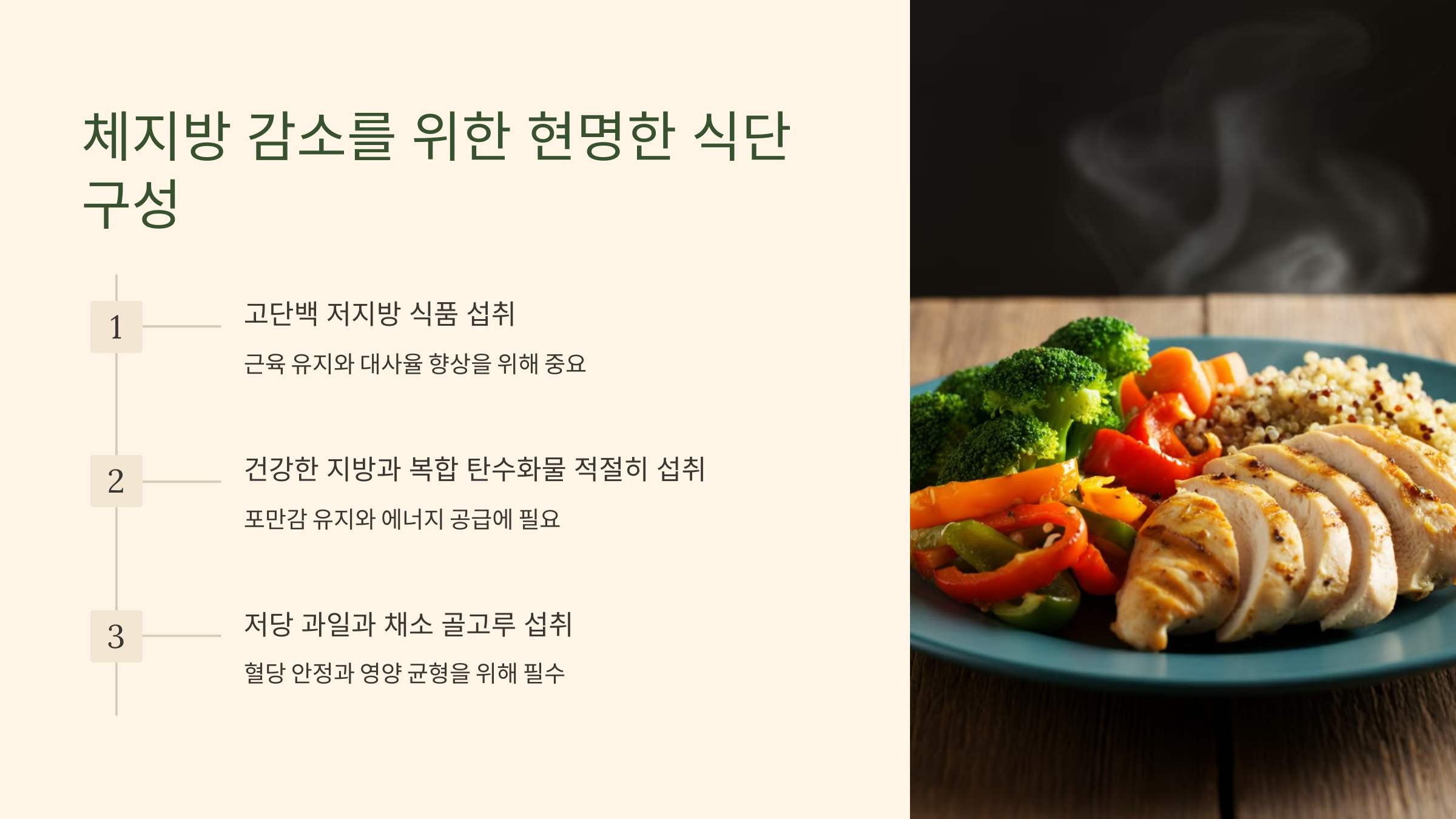 체지방 감소를 위한 식품 선택은 다이어트 성공에 있어 중요한 부분을 차지합니다. 고단백 저지방 식품을 섭취하면서 건강한 지방과 복합 탄수화물을 적절히 섭취하는 것이 핵심입니다. 또한, 저당 과일과 채소를 골고루 섭취해 포만감을 유지하며 간식 선택도 현명하게 하는 것이 중요합니다. 마지막으로 체지방 연소를 돕는 음료를 활용해 다이어트를 효과적으로 이어갈 수 있습니다.