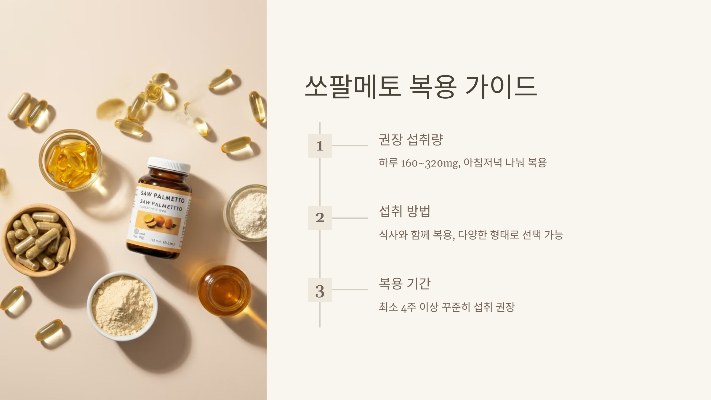 - 일반적으로 하루 160~320mg의 쏘팔메토 추출물이 권장됩니다.