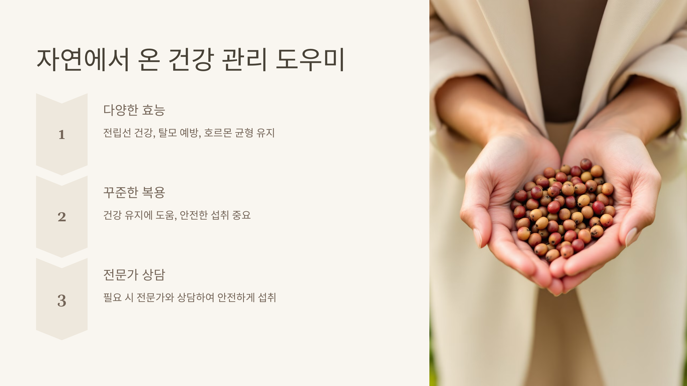 - 전립선 건강이나 탈모 개선을 위한 장기 복용 시에는 전문가와 상담하세요.
