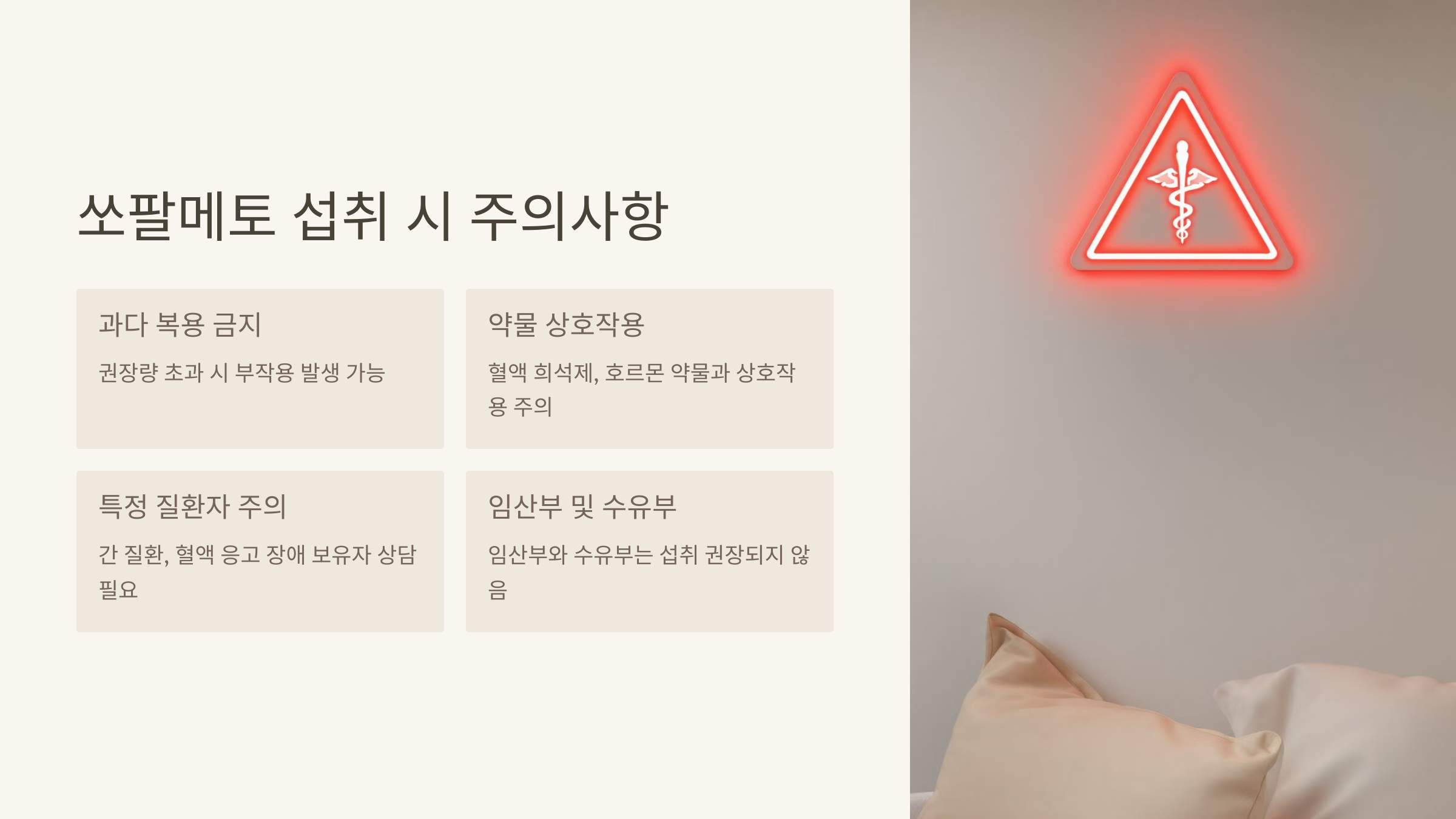 쏘팔메토는 비교적 안전한 보충제로 알려져 있지만, 아래의 주의사항을 반드시 숙지하세요.