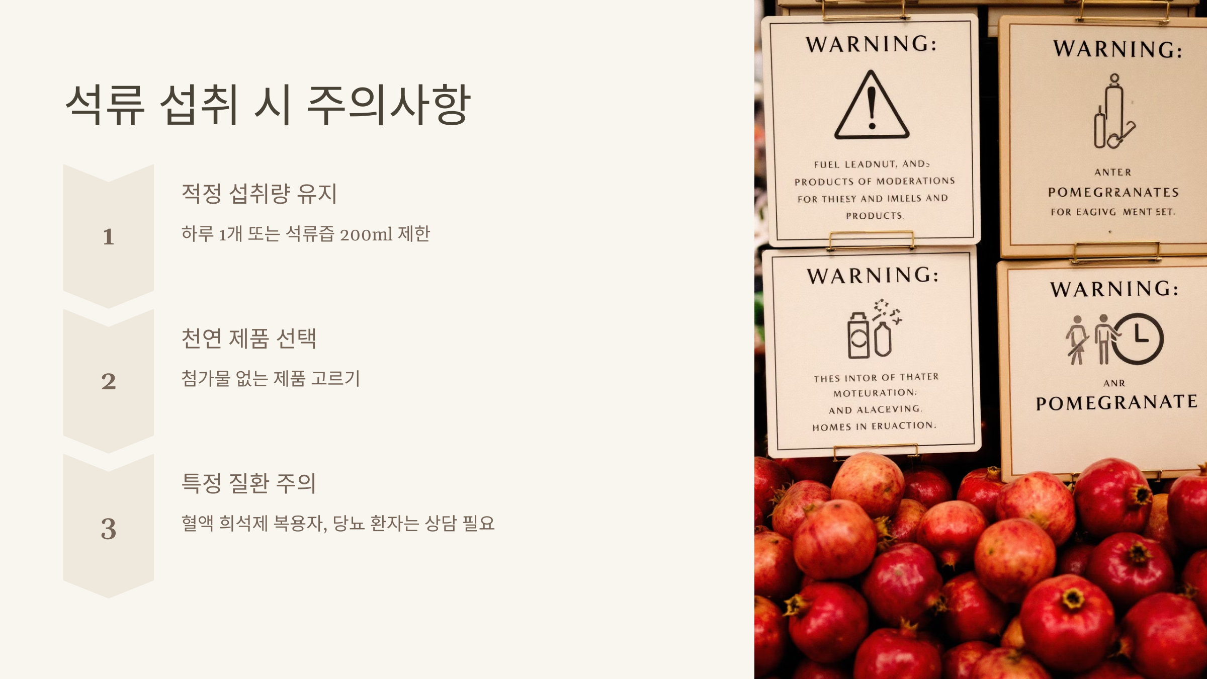 - 혈액 희석제를 복용 중이거나 당뇨가 있는 경우, 석류 섭취 전 의사와 상담하세요.